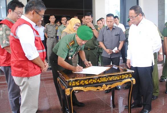Danrem 044 Gapo Kol Inf Tri Winarno selaku Dansatgas Karlanhut Sumsel disaksikan Wakil Bupati OKI HM Rifai SE dan Dirut PT Bumi Andalas Permai Sapto Nursetyo menandatangi surat serah terima alat ISPU