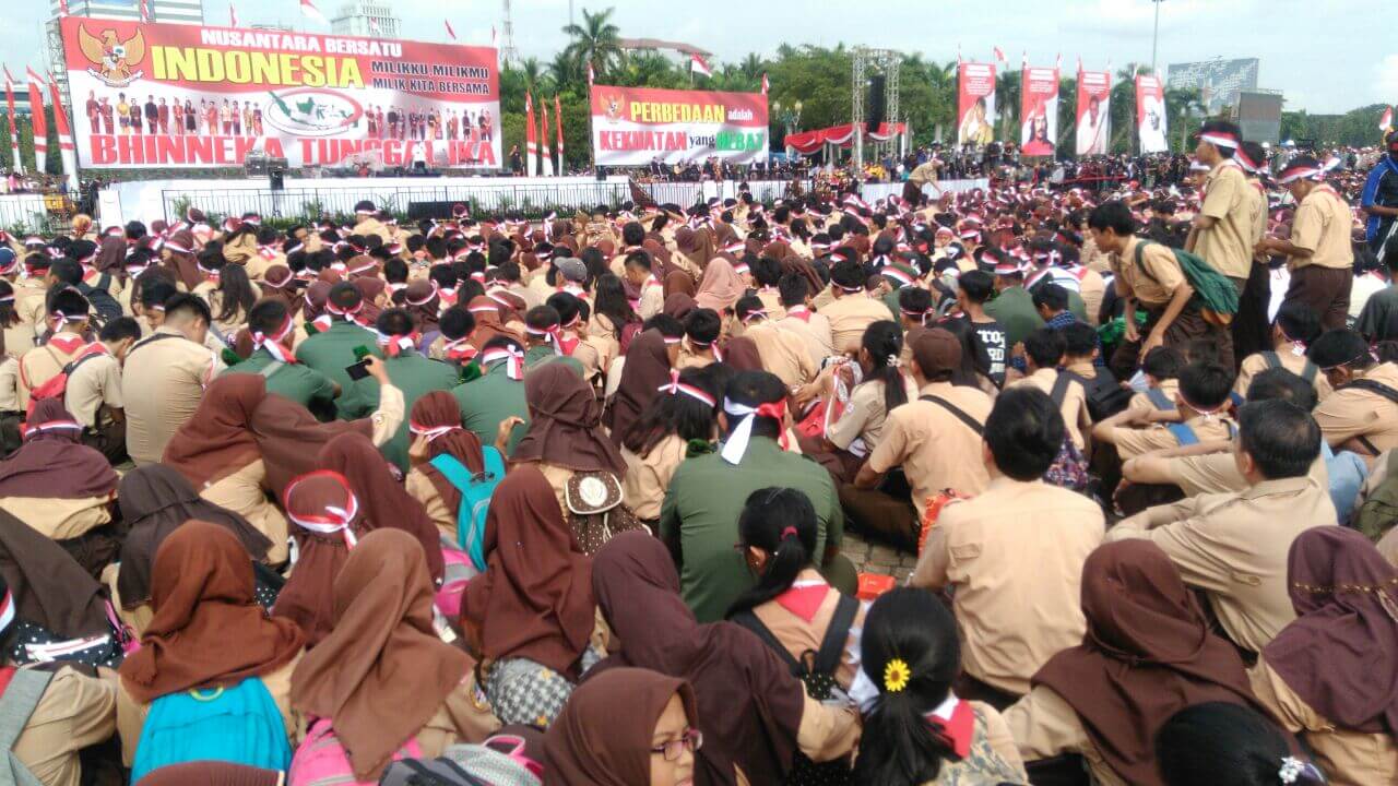 Ribuan anggota Polri dan TNI memadati lapangan monas berbaur dalam acara Nusantara Bersatu., ribuan orang baik aparat Polri, TNI dan masyarakat sudah memadati kawasan Monas sejak pukul 06.00 WIB tadi pagi. Ribuan anggota Polri, TNI dan masyarakat dari wilayah Jabodetabek ini berkumpul mengenakan ikat kepala berwarna merah putih.