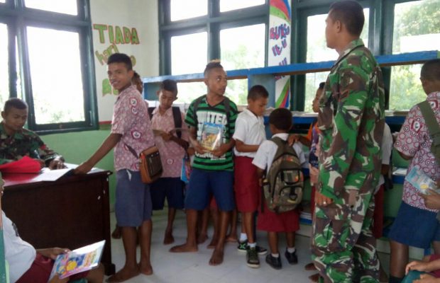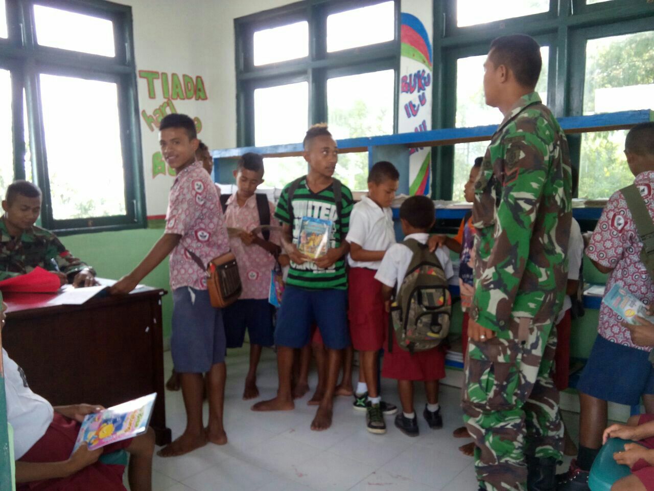 Sumarna juga menuturkan, “Buku-buku yang tersedia di taman bacaan meliputi buku-buku ilmu pengetahuan tingkat SD dan SLTP, buku sejarah, buku ilmu pengetahuan umum, buku pertanian dan peternakan, buku cerita anak, majalah dan buku rohani umat katolik, buku-buku tersebut sengaja kami bawa dari satuan kami yaitu Yonif Raider 321/Galuh Taruna tepatnya di majalengka Jawa Barat” tuturnya.