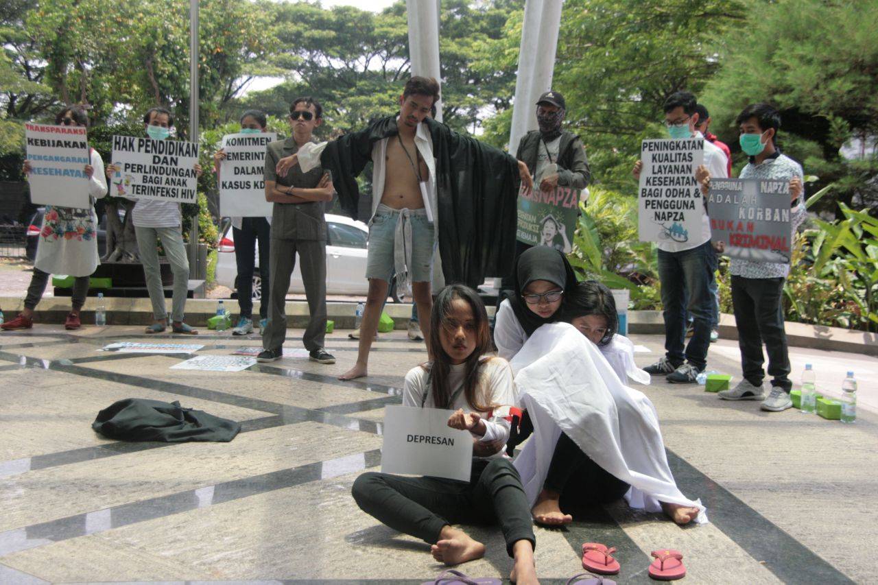 Selain itu ada juga bertuliskan “Pengguna Napza adalah korban bukan kriminal”, “Pendidikan cerdas Napza dan kesehatan reproduksi bagi remaja”, “Stop Stigma dan Diskriminasi bagi ODHA”, “Komitmen Pemerintah dalam kasus kekerasan dalam rumah tangga”