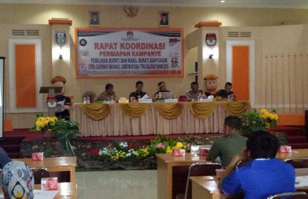 rapat Koordinasi Persiapan Kampanye Pemilihan Bupati dan Wakil Bupati Banyuasin serta Gubernur tahun 2018. Berdasarkan pedoman teknis Jelas Salinan, kampanye dibagi dua, kampanye yang difasilitasi oleh KPU, dan kampanye yang dilaksanakan Pasangan Calon bersama parpol atau gabungan parpol pengusung.