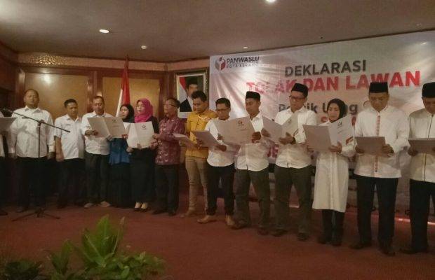 Oleh karena itu menghadapi tangtangan tersebut Panwaslu Kota Serang mengajak semua komponen khususnya bagi pemangku kepentingan ke pemilu an ditanah air untuk sama – Sama mewujudkan pemilu yang bersih berkualitas dan menjungjung nilai-nilai luhur bangsa yaitu kita bersama – sama melakukan deklarasi tolak dan lawan politik uang dan politisasi sara untuk pilkada 2018 yang berintegritas.