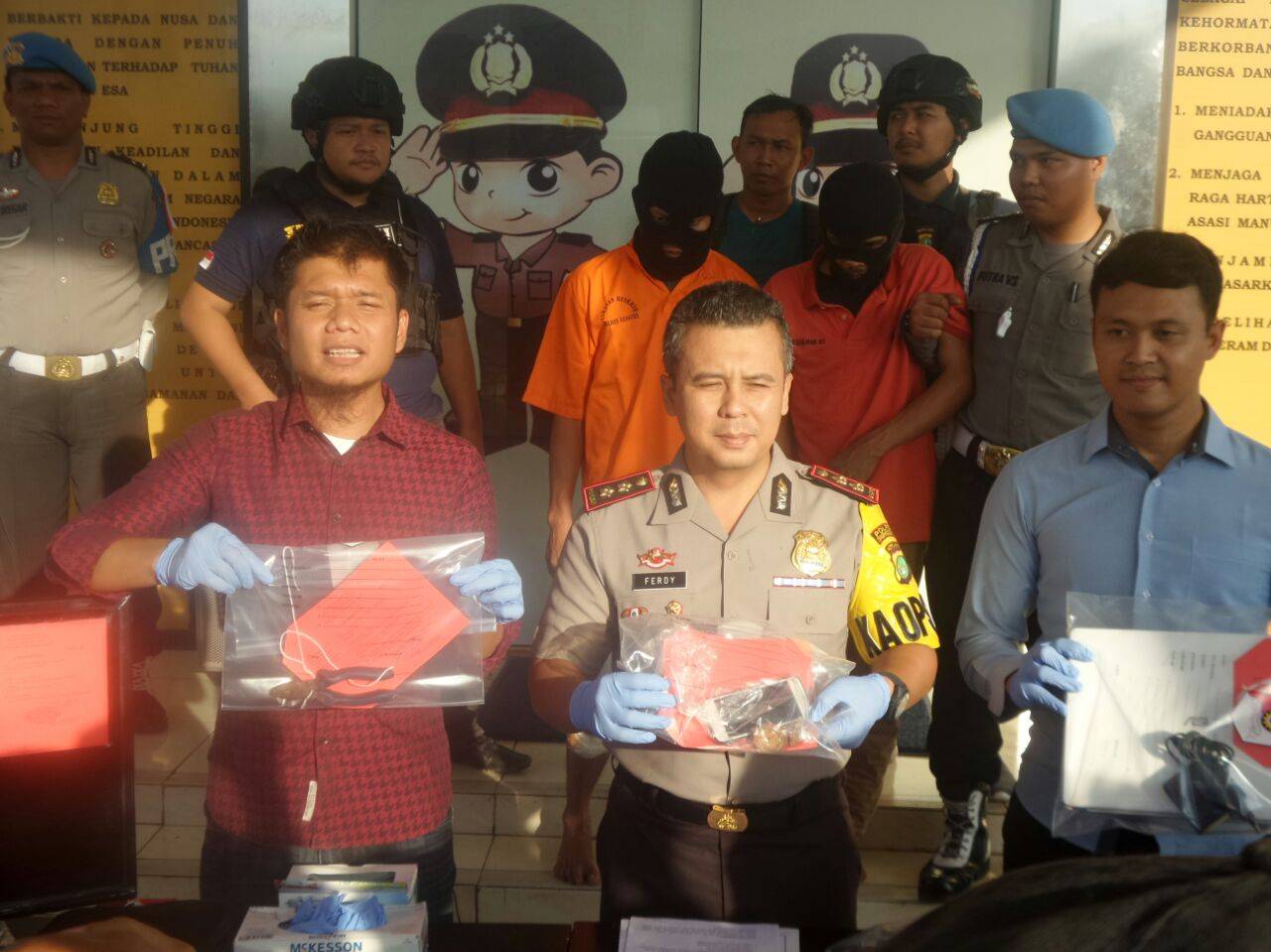 Saat menggelar Konfrensi Pers di Halaman Mapolres Tangsel, Kapolres Tangsel, AKBP Ferdy Irawan mengatakan, Dua pelaku tersebut berinisial UH (29) dan TH (28) yang diamankan di tempat yang terpisah. Tersangka UH diamankan di Stasiun Kereta Api Sudimara, sedangkan tersangka TH diamankan di kediamanya.