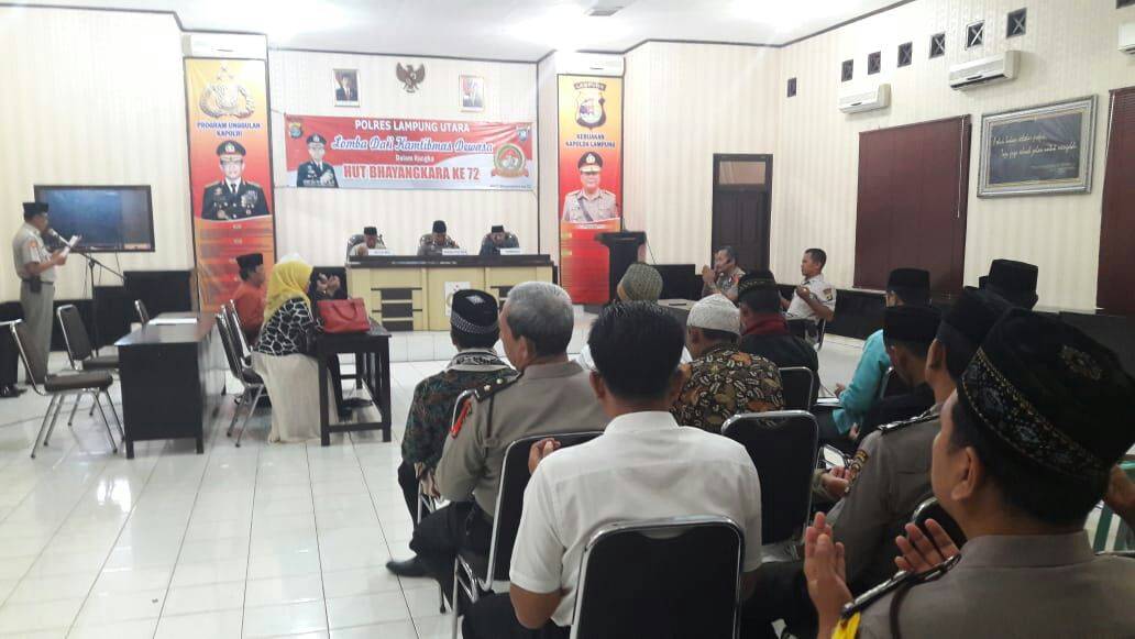Acara yang di ikuti sebanyak 10 orang Da’i Kamtibmas yang berasaal dari perwakilan 10 Polsek Jajaran Polres Lampung Utara di hadiri oleh Wakapolres Lampung Utara Kompol Yustam Dwi Heno, S.I.K, S.H, M.H, Kabag Ren Kompol M. Sohar, Kasat Binmas AKP M. Taupiq, Ketua MUI Lampung Utara H. Mughofir, Kemenag Kab. Lampung Utara H. Makmur, M,Pd.I dan Ketua Juri Dai Kamtibmas Drs. KH. Mawardi Ishaq bersama Tim.