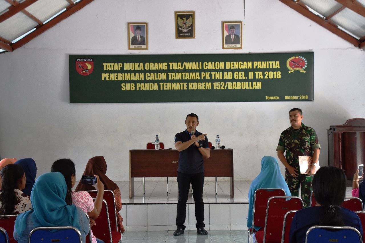 Jurnalline.com, Maluku Utara – Korem 152/Babullah menggelar pengarahan kepada para orang tua calon peserta werving Secata PK Gel. II TNI AD Ta. 2018 bertempat di Gazebo Nuku Makorem 152/Babullah Jl. A.M. Kamarudin No. 1 Kel. Sangaji Ternate Utara, Minggu (28/10/2018).