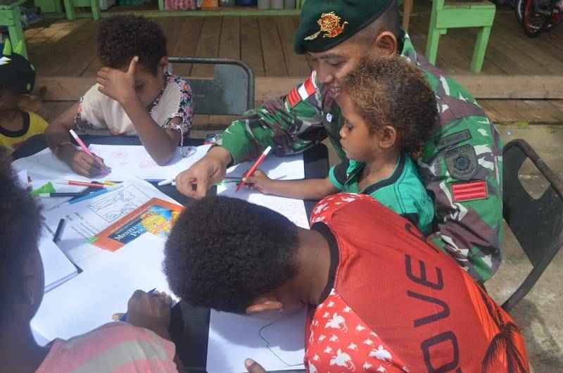 Sesuai dengan semboyan “Belajar Sambil Bermain” Personel Satgas mengisi kegiatan dengan mewarnai buku gambar, belajar berhitung, membaca buku cerita dongeng dan diselingi dengan permainan-permainan tradisional yang sudah disiapkan oleh personel Satgas Yonif PR 328 Kostrad.