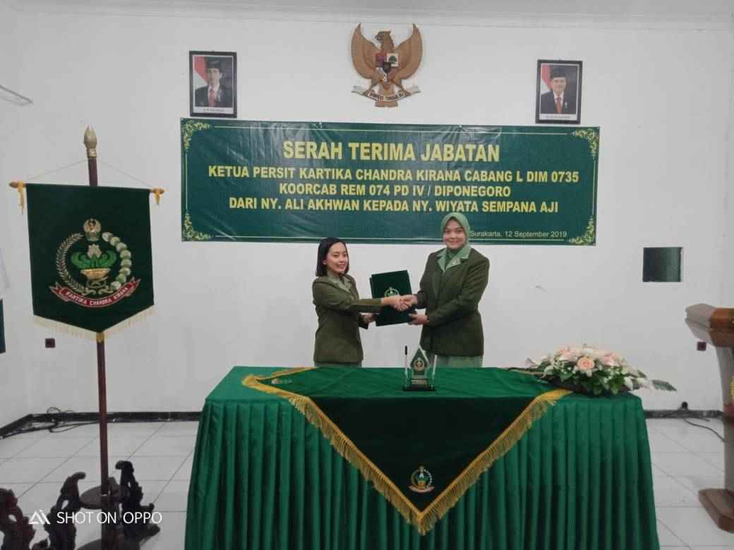 Serah terima jabatan Ketua Persit KCK Cab L Dim 0735 telah dilaksanakan di Kantor Persit KCK Cab L Dim 0735 dihadapan Ketua Persit KCK Koorcab Rem 074 PD IV/Diponegoro Ibu Rafael Granada Baay dan seluruh Pengurus Persit Koorcab Rem 074 PD IV Diponegoro.
