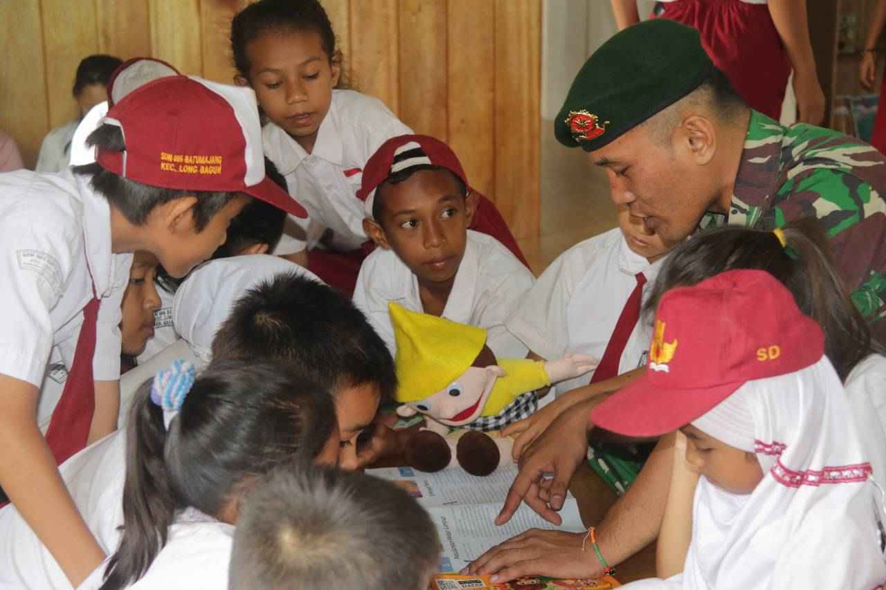 Siswa/Siswi SDN 005 Batu Majang terlihat sangat gembira ketika rombongan tenaga pendidik dari Satgas Yonif Raider 303 datang ke sekolah yang bertujuan untuk membantu pihak sekolah dalam kegiatan mengajar.