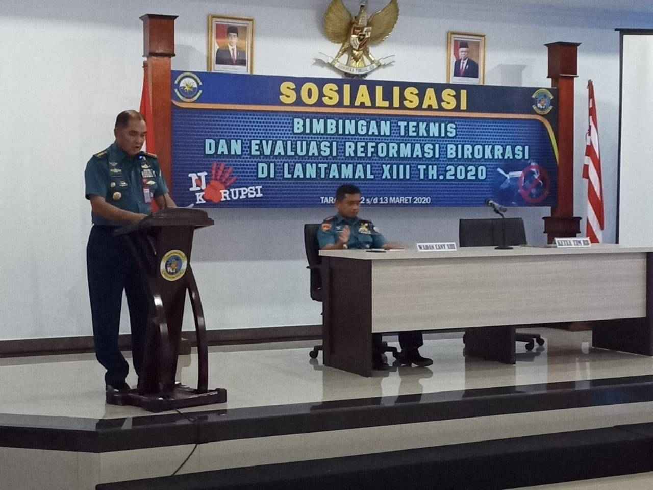 Dalam sambutan Danlantamal Xlll yang bacakan oleh Wadan Lantamal Xlll, Kolonel Marinir Ali Bahar Saragih, disampaikan bahwa dengan adanya kegiatan sosialisasi bimtek dan evaluasi reformasi birokrasi ini diharapkan pra prajurit dan PNS akan dapat memahami dan melaksanakan program reformasi birokrasi dengan baik.