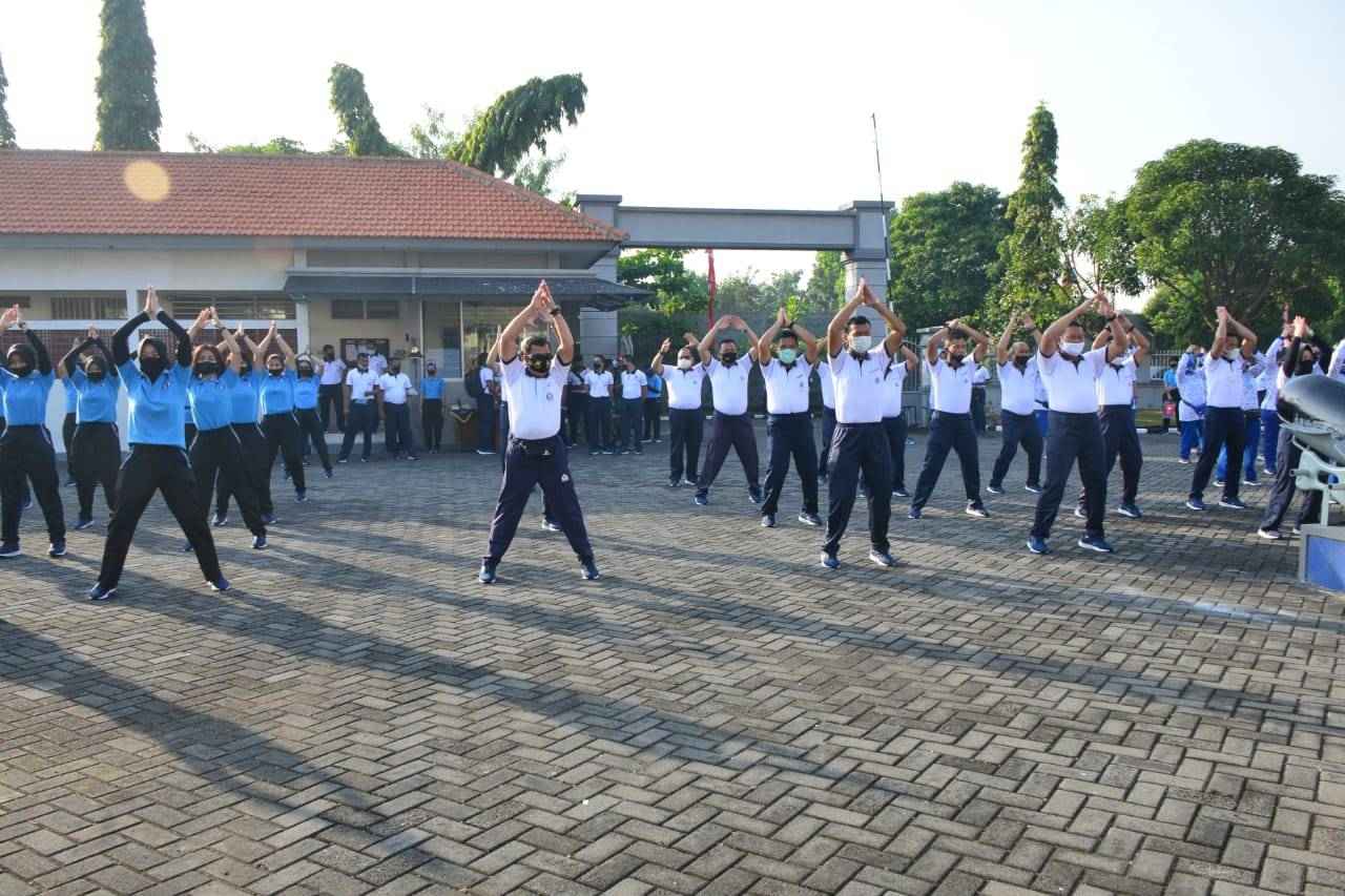 Gubernur Akademi Angkatan Laut (AAL) Laksda TNI Edi Sucipto, S.E., M.M. didampingi Ketua Cabang Berdiri Sendiri Jalasenastri AAL Ny. Eni Edi Sucipto mengikuti olahraga bersama Kepala Staf Angkatan Laut (KASAL) Laksamana TNI Yudo Morgono, S,E., M.M. dan anggota Korps Wanita Angkatan Laut (Kowal) Wilayah Surabaya, Jumat (26/6).