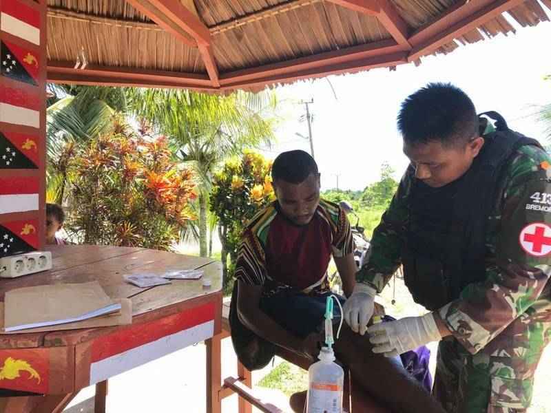 Bertempat di Distrik Muara Tami, personel kesehatan Satgas Pamtas RI-PNG Yonif Mekanis Raider 413 Kostrad melaksanakan pengobatan infeksi luka terhadap pemuda atas nama saudara Sait (19).