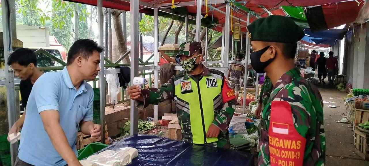 Anggota Koramil 05/Bantargebang di bantu personil BKO dari Yonif mekanis 202/TM turun ke pasar tradisional Bantargebang untuk mencegah penyebaran Covid-19.