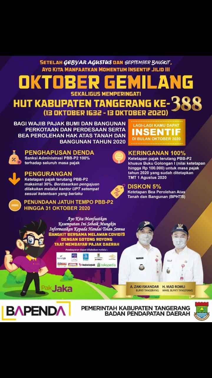 “Program ini kita mempertimbangkan karena Oktober ini bulan kebahagiaan masyarakat Kabupaten Tangerang, karena bulan ini adalah kelahiran Kab. Tangerang yang ke- 388 tahun berdasarkan kajian yang terbaru, oleh karena itu mari manfaatkan program Oktober Gemilang ini untuk memenuhi kewajiban perpajakannya baik PBB maupun BPHTB,” Ujar Zaki.