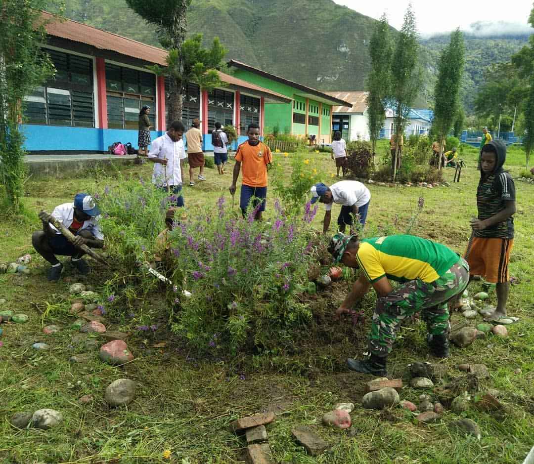 Letda Inf Permadi Permana selaku Danpos Pos Kurulu mengajak 8 orang anggotanya melaksanakan perbaikan taman di sekolah agar terlihat lebih rapi dan indah.