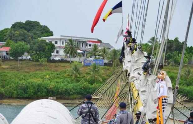 Bupati Maluku Tenggara mengucapkan selamat datang di Kota Tual kepada KRI Bima Suci yang membawa Taruna Taruni Akademi Angkatan Laut.