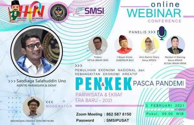 Jurnalline.com, Jakarta – Dalam rangka memperingati Hari Pers Nasional (HPN) yang jatuh pada 09 Februari 2021, Serikat Media Siber Indonesia (SMSI) menggelar beberapa rangkaian kegiatan salah satunya seminar Nasional yang digelar secara virtual pada 03 Februari 2021 mendatang dengan mengusung tema “Pemulihan Ekonomi Nasional dan Kebangkitan Ekonomi, Pasca Pendemi (PENKEK Pasca Pandemi)”.