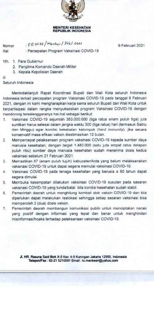 Hasil dari Menindaklanjuti Rapat Koordinasi Bupati dan Wali Kota seluruh Indonesia terkait percepatan program Vaksinasi COVID-19 pada tanggal 8 Februari 2021