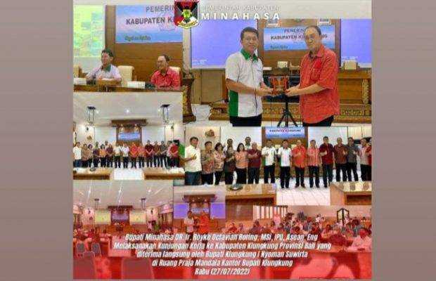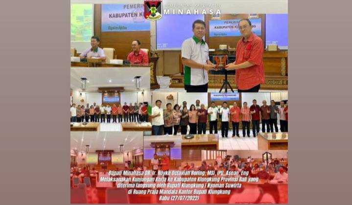 Jurnalline.com, Minahasa – Bupati Minahasa Dr Ir Royke Octavian Roring, MSi didampingi Asisten I Drs Riviva Maringka, MSi dan Asisten III Dr Vicky Tanor melakukan kunjungan kerja di Kabupaten Klungkung Bali yang disambut langsung oleh Bupati Klungkung I Nyoman Suwirta,S.Pd.,M.M, Rabu (27/7/2022).
