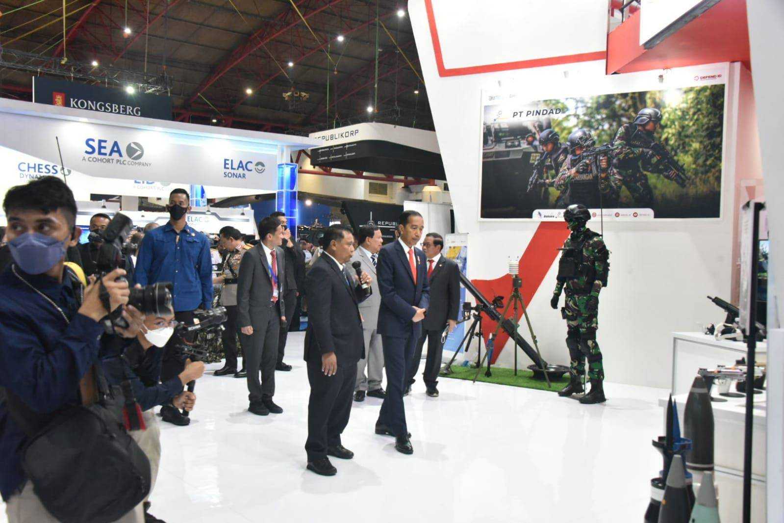 Selain mengunjungi sejumlah stan, Presiden Jokowi bersama Menhan Prabowo Subianto dan Kasal Laksamana TNI Yudo Margono serta pejabat pendamping lain, juga berkesempatan menyaksikan live demo yang menampilkan kemampuan prajurit TNI dan kendaraan produksi dalam negeri dalam satu operasi militer.