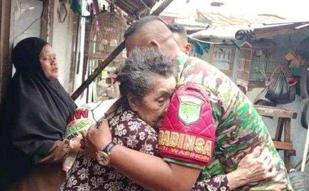 Terlihat di lokasi, Ibu. Rihani pemilik rumah yang di kunjungi Babinsa memeluk haru Sertu. Bowo saat akan meninggalkan rumahnya.