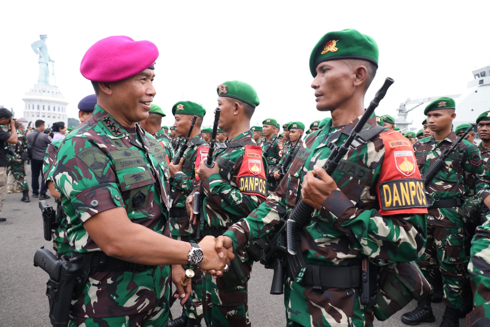 Jurnalline.com, TNI AL. Kodiklatal. Surabaya –:Komandan Komando Pembinaan Doktrin, Pendidikan dan Latihan TNI AL (Dankodiklatal) Letjen TNI Marinir Suhartono mengapresiasi Satuan Tugas (Satgas) Pengamanan Perbatasan (Pamtas) Kewilayahan Provinsi Papua dan Papua Barat yaitu Batalyon Infanteri (Yonif) 527/Baladibya Yudha (BY) dan Yonif 407 / Padma Kusuma (PK) yang dilepas keberangkatannya oleh Panglima TNI Laksamana TNI Yudo Margono, bertempat di Dermaga Madura Koarmada II, Ujung Surabaya. Sabtu, ( 01/04/2023).