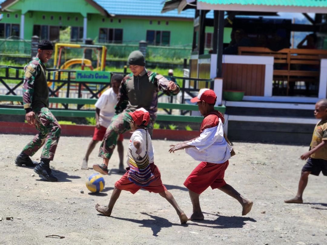 Potret keceriaan anak-anak Intan Jaya saat bermain bola bersama prajurit Tri Dharma menunjukkan eratnya hubungan kekeluargaan yang terjalin antara prajurit Satgas 330 dengan masyarakat di wilayah penugasan.