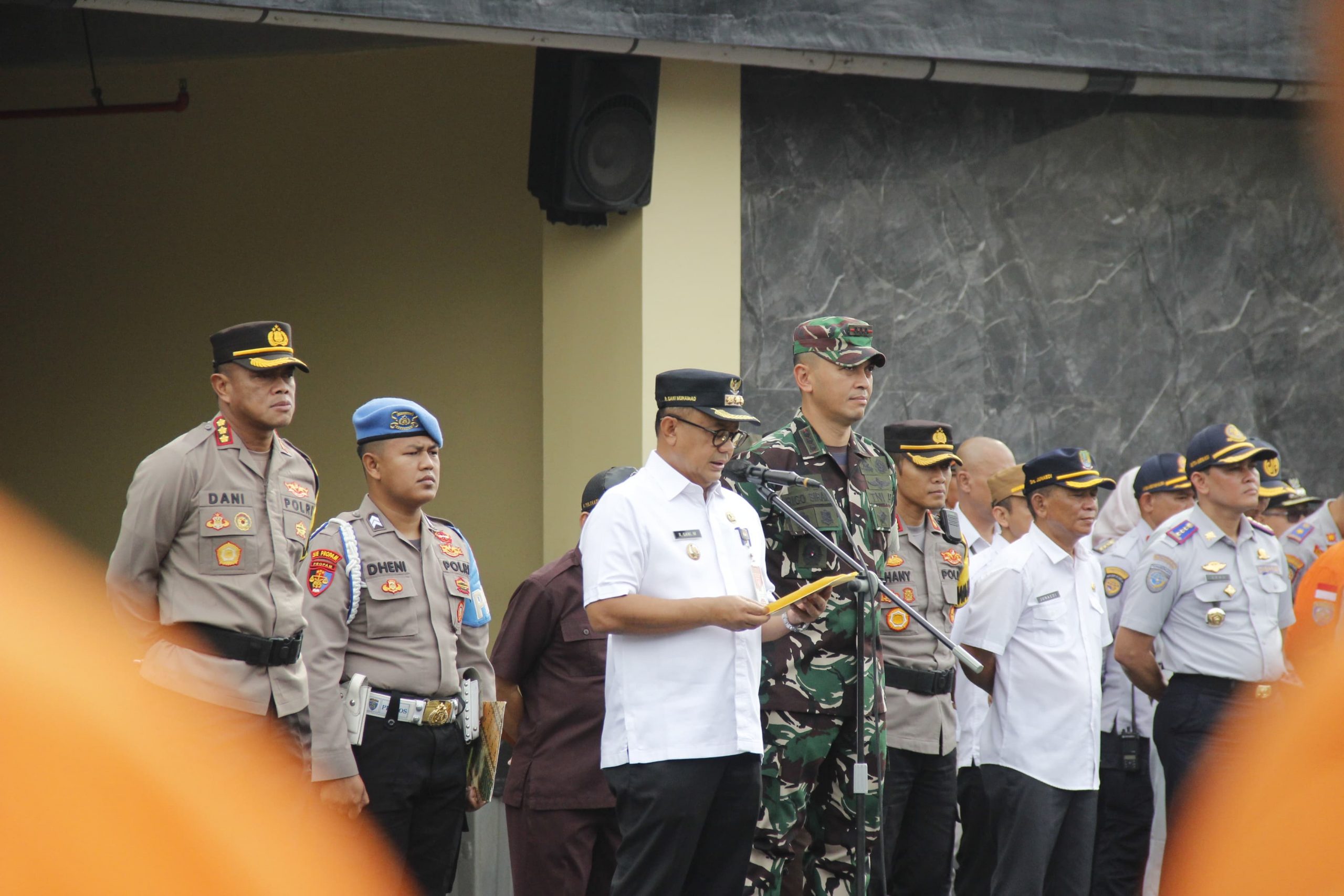 Pelaksanaan kegiatan apel gelar pasukan dipimpin PJ Walikota Bekasi R Gani Muhammad didampingi Kapolres Metro Bekasi Kota Kombes Pol Dani Hamdani dan Dandim 0507/Bekasi Kolonel Arm Rico Ricardo Sirait.