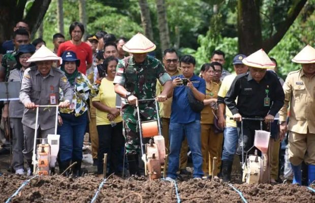 Kepala Staf Kodam XIII/Merdeka (Kasdam XIII/Merdeka Brigjen TNI Yustinus Nono Yulianto menghadiri kegiatan penanaman perdana jagung 1 juta hektar yang dilakukan secara serentak tersebar di Kabupaten dan Kotamadya di seluruh Indonesia. Selasa (21/1/2025)