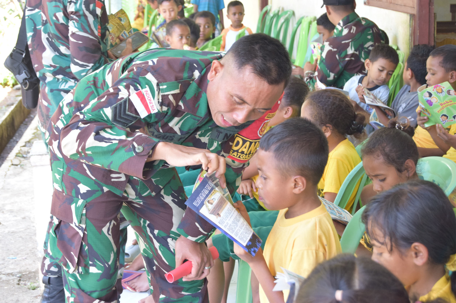 Program ini menghadirkan kendaraan yang dimodifikasi menjadi perpustakaan keliling dan wahana edukasi, membawa berbagai koleksi buku serta sarana belajar interaktif langsung ke tengah-tengah siswa di daerah perbatasan. Kehadiran prajurit Satgas disambut dengan antusiasme tinggi oleh para murid yang tampak bersemangat mengikuti kegiatan belajar dan membaca bersama.