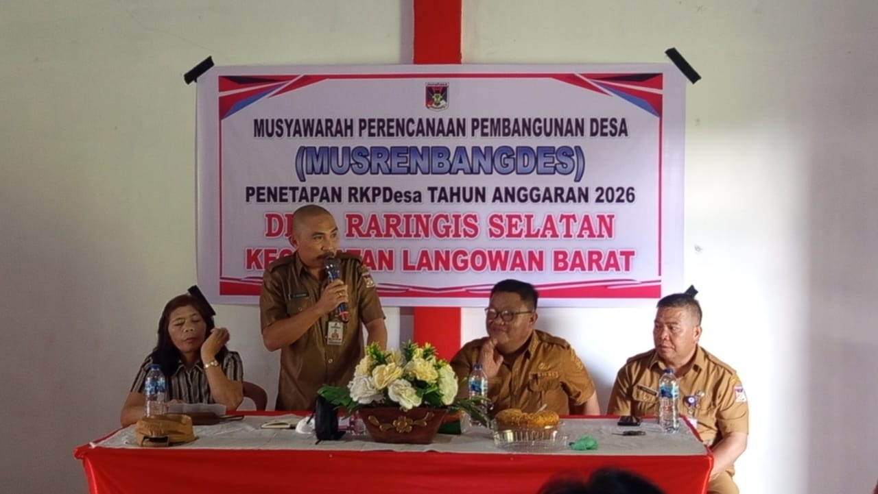Jurnalline.com, Langowan, (MINAHASA) — Bertempat di Balai Desa Raringis Selatan Kecamatan kacamatan Langowan Barat, Kab. minahasa Selasa, (11/11/2025), dihadiri oleh Camat Langowan Barat Donald Lumingkewas, S.Pt, MAP didampingi Sekcam Langowan Barat, Pnt. Jody Moniung, S.Sos, Hukum tua desa Raringis Selatan Rizky Rorong, S. Sos. Membuka kegiatan Musyawarah Perencanaan Pembangunan Desa (MUSREMBANGDES) dan Penetapan RKPDes Tahun Anggaran 2025.
