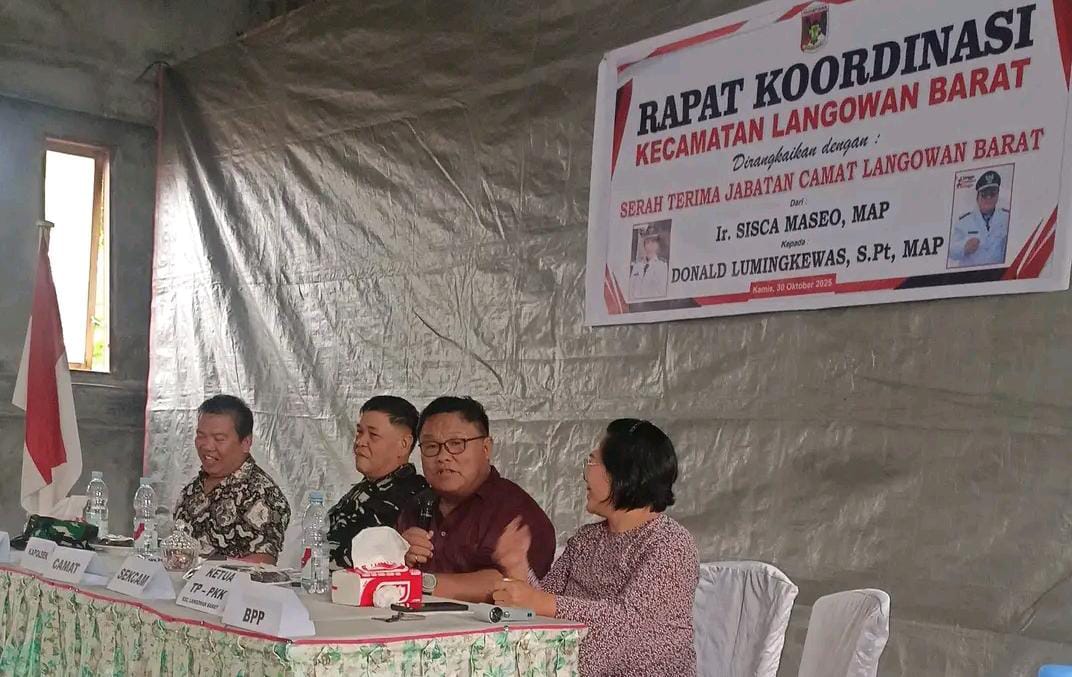 Sebelumnya Camat Langowan Barat yang baru, Donald Lumingkewas, S.Pt, MAP, menyampaikan apresiasi kepada pejabat sebelumnya atas dedikasi dan pengabdiannya selama memimpin Kecamatan Langowan BaratBarat kab. Minahasa sembari mengajak kepada seluruh jajaran pemerintah kecamatan serta perangkat desa untuk memperkuat sinergi dan kerja sama dalam melayani masyarakat.