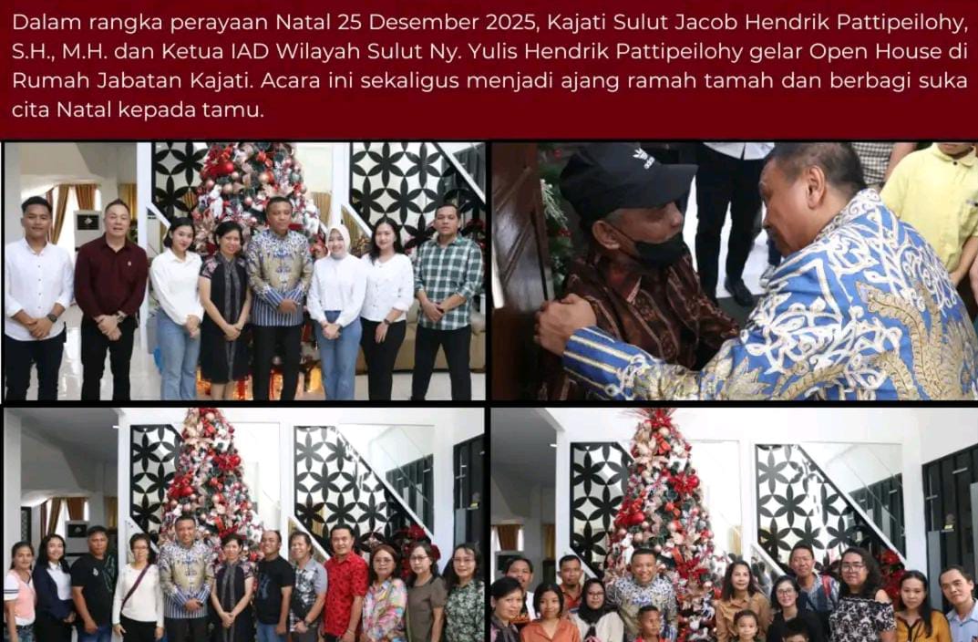 Jurnalline.com, Manado — Dalam rangka perayaan Hari Raya Natal, 25 Desember 2025, Kepala Kejaksaan Tinggi Sulawesi Utara Jacob Hendrik Pattipeilohy, S.H., M.H. bersama Ketua IAD Wilayah Sulawesi Utara Ny. Yulis Hendrik Pattipeilohy menggelar kegiatan Open House Natal di Rumah Jabatan Kajati Sulut.