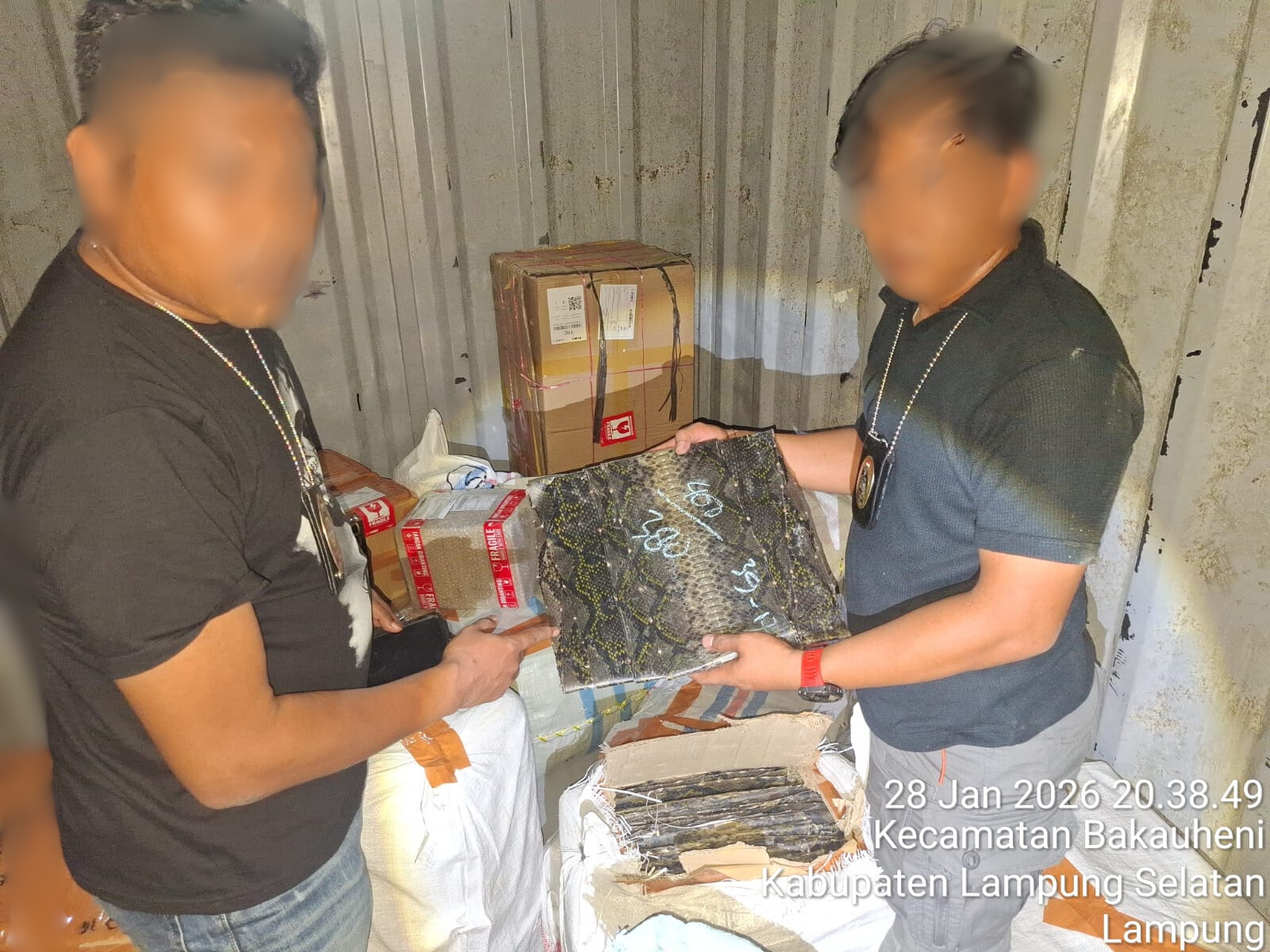 Barang bukti yang berhasil diamankan berupa 445 lembar kulit ular piton yang dikemas dalam tiga kardus besar berasal dari Pekanbaru dan tujuan Surabaya, serta lima keranjang berisi kura-kura jenis kura-kura lokal dan kura-kura Afrika dengan total 32 ekor, yang dikirim dari Pekanbaru dengan tujuan Cirebon dan Denpasar.
