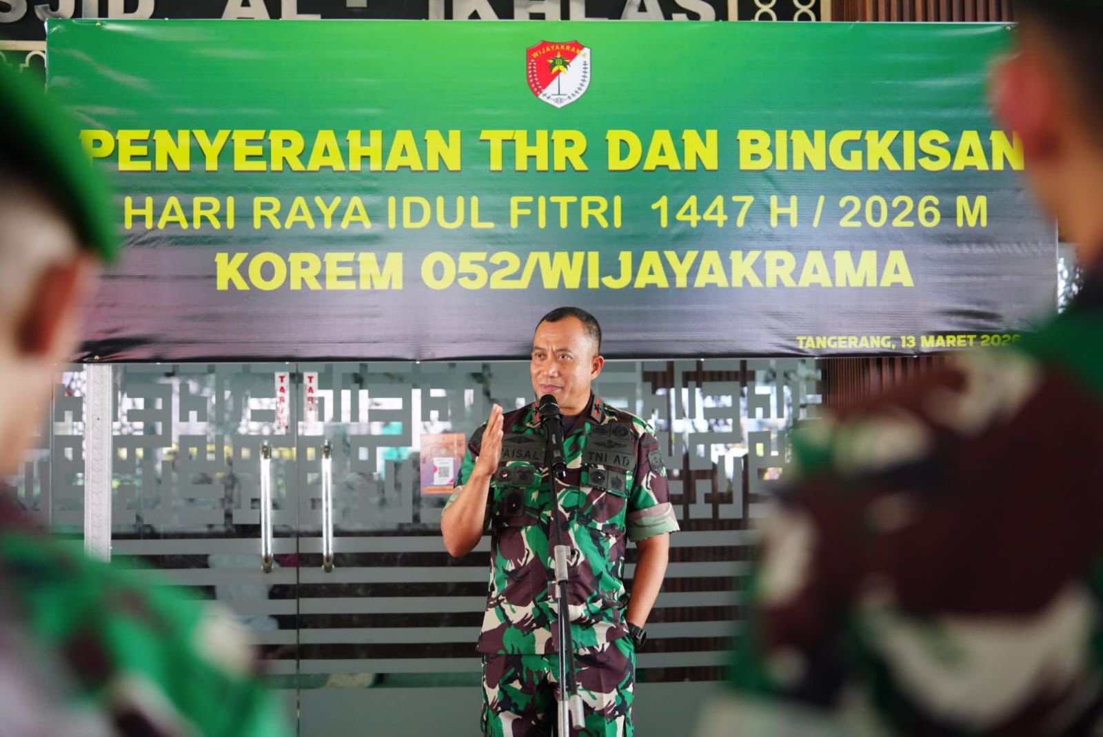 Jurnalline.com, Tangerang – Menyambut Hari Raya Idul Fitri 1447 Hijriah, Komandan Korem 052/Wijayakrama Brigjen TNI Faizal Rizal, S.I.P. menyerahkan Tunjangan Hari Raya (THR) dan bingkisan Lebaran kepada prajurit dan Pegawai Negeri Sipil (PNS) Korem 052/Wkr. Kegiatan tersebut dilaksanakan di halaman Masjid Al Ikhlas Korem 052/Wkr, Jumat (13/3/2026).