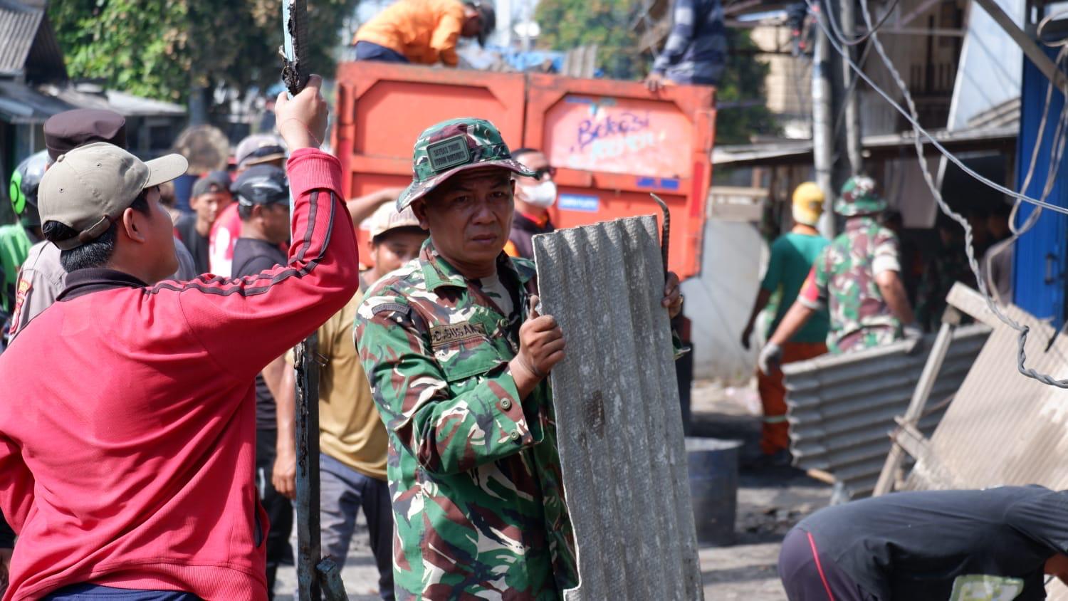 Kegiatan tersebut melibatkan antara lain TNI, Polri, Aparatur Kecamatan Cimuning, Dinas Pemadam Kebakaran Kota Bekasi, Dinas Lingkungan Hidup (DLH) Kota Bekasi, serta unsur pendukung lainnya yang bahu membahu membantu warga membersihkan puing-puing bangunan dan sisa-sisa material yang terdampak kebakaran.
