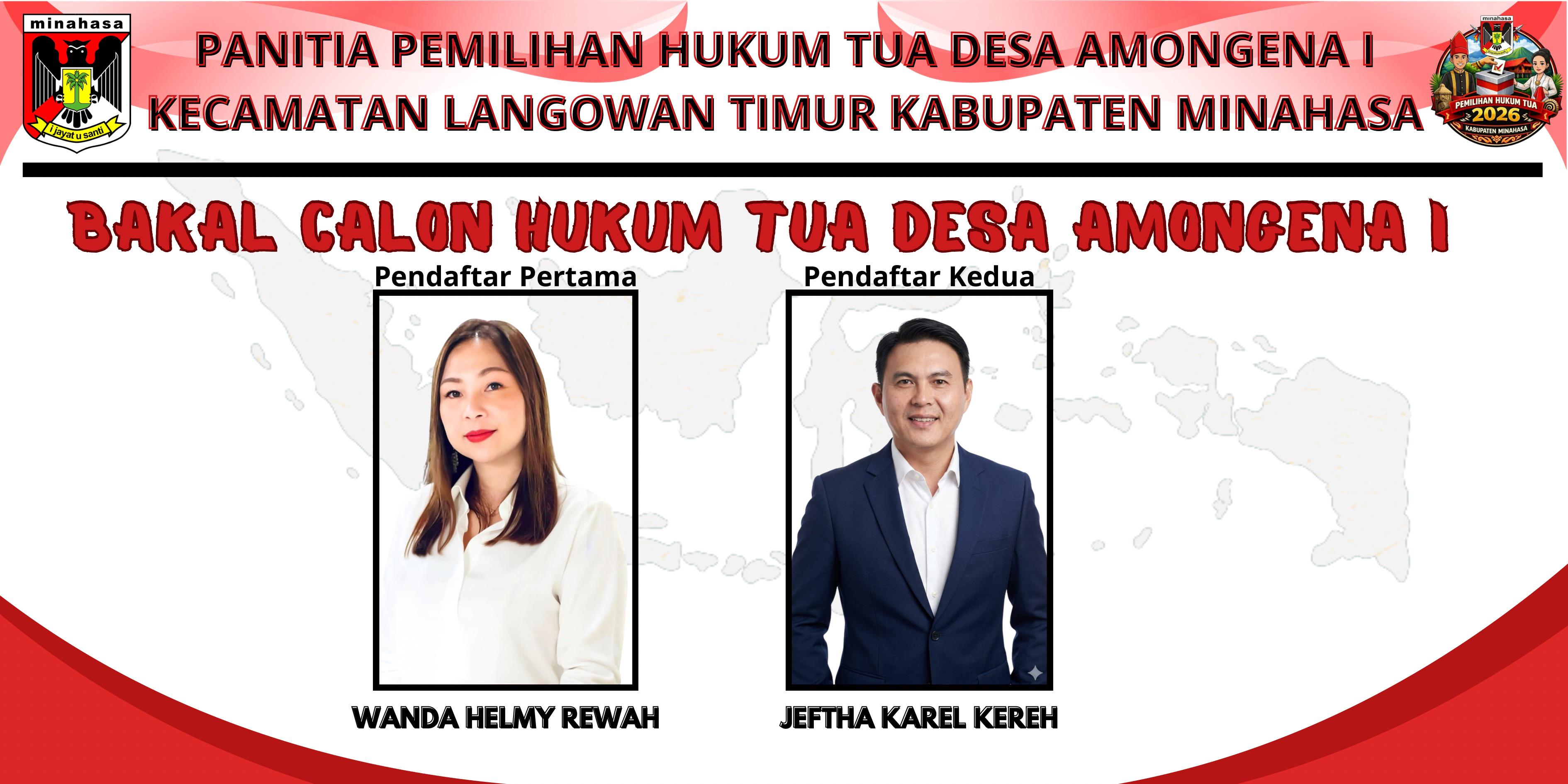 Untuk desa Amongena I kecamatan Langowan Timur ada dua Bakal Calon Hukum Tua yang telah mendaftar dan sudah diserahkan ke Kecamatan dan Kabupaten, “Saat ini dari Panitia masih sementara pendataan daftar pemilih sementara dan Panitia masih menunggu masyarakat yang belum terdaftar sebagai pemilih sementara dan masih menunggu sampai pada sore ini 30 April 2026.” Ujar Mercy Iroth