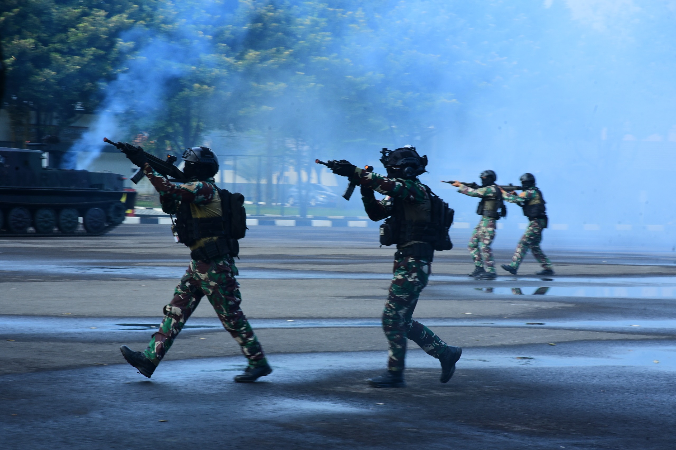 Aksi berlanjut dengan simulasi udara menggunakan pesawat King Air sebagai unsur bulsi pada pukul 08.15 WIB, disusul pergerakan helikopter yang melaksanakan approach serta hover di atas Gedung Cakra untuk upaya ekstraksi. Namun, dalam skenario ini, tim udara terpaksa meninggalkan lokasi karena respons pertahanan udara (Hanud) Korps Marinir yang sigap melakukan penindakan.
