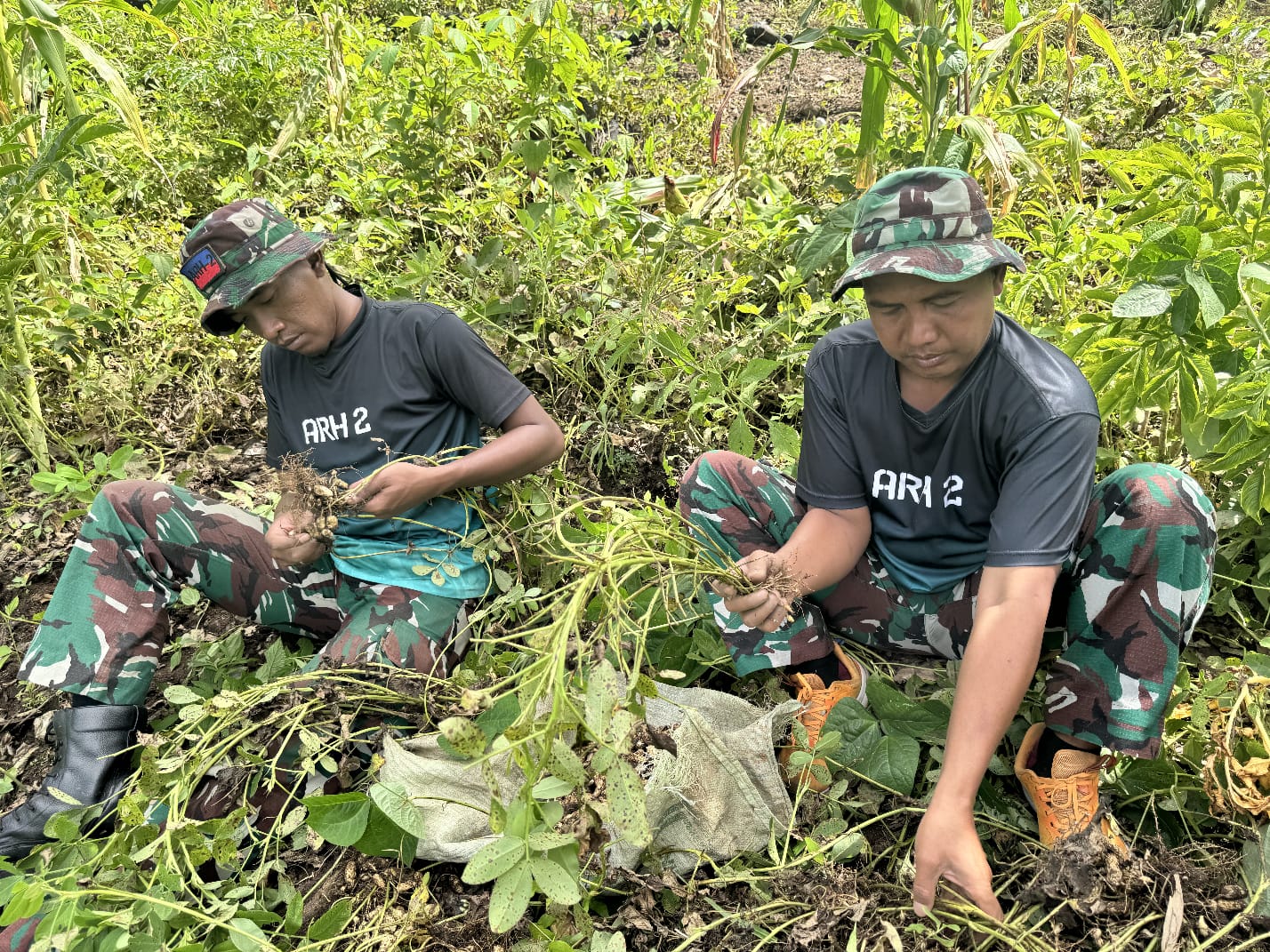Wujud Kemanunggalan, Satgas Pamtas Yonarhanud 2 Kostrad Bahu-Membahu Panen Kacang Tanah di Perbatasan